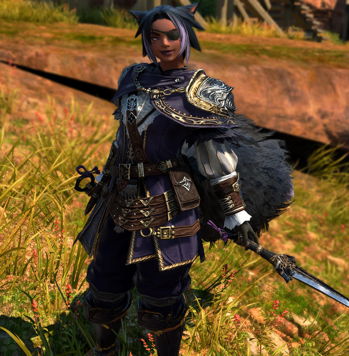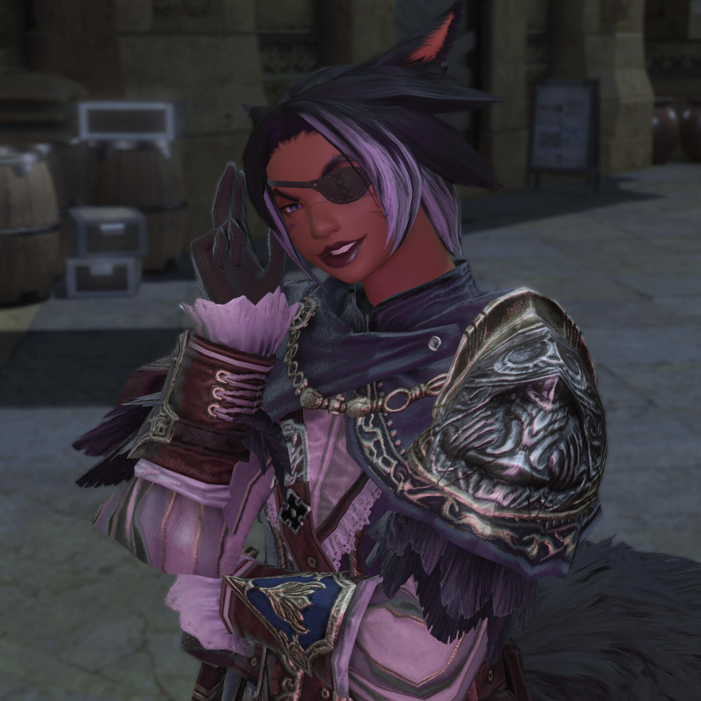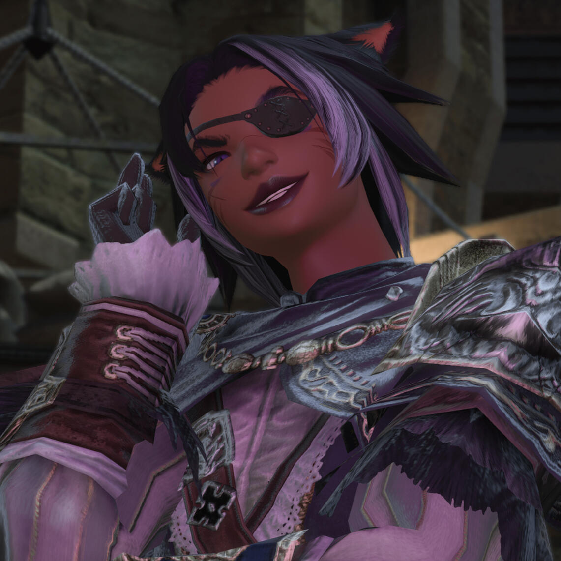 J'hulsha Thanthea is a Miqote from Ul'dah who specialises in the culinary arts and as a bounty collector for men and monsters alike. For those from a more criminal background, she also works as a career criminal, specialising in burglary and assassination; despite this, she's known to be picky about both her clientel and the jobs she selects. From looks alone, one can guess that she is part Hingan, Ala Mhigan and Ul'dahn.Despite being rather outgoing, it's easy to end up on J'hulsha's bad side & hard as nails to escape it, and by the Twelve you'll know it. If you get on her good side, though, she'd throw herself in front of a dragon's fire for you. When in a fight, J'hulsha battles through haphazardly forcing aether through her twin daggers, twisting her basic knowledge of thaumaturgy into a variety of different attacks.