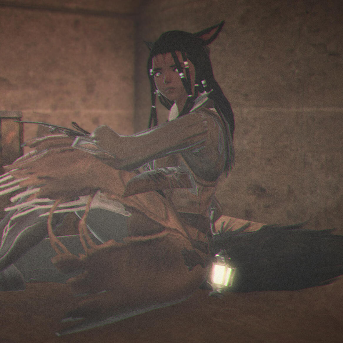 24 years ago, a Miqote woman from the J tribe fled from Ala Mhigo as the Garleans marched in, fearing the fate that would befall her if she was to be caught in the middle of the invasion. She was right to be afraid, the hectic noise of steel clashing against steel, houses being raized to the ground and her people screaming in terror on the very night she left. All she had left was a knapsack that grew lighter by the day, failing to find any succor at Gridania. From there, she made the treacherous journey to Ul'dah, where fortune seemed to smile at her; she'd caught the eye of an attractive, half-Hingan son of a merchant who sought a warm body to lay with. Her mother had been lavished with promises of marriage and eternal love, led into bed and remained by his side for half a year, before the signs of pregnancy reared it's ugly head. Fearing the consequences, her father immediately did away with her, tossing her to the sheets in the fine silks he gifted upon her. Opulence turned to desperation in days, whatever baubles and finery that she could protect from being stolen instead going towards stays in ramshackled inns and measly scraps of food. It was in one of those inns where J'hulsha was born as a little boy, the bartender being kind enough to at least donate a towel to wrap her in.